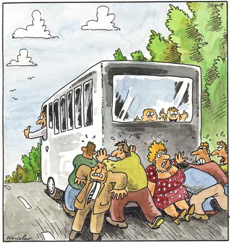 "Nur noch 15 Kilometer bis zur nächsten DKV-Zapfsäule!" ("Eddy und sein Boss" ist eine Auftragsarbeit für die Gütegemeinschaft Buskomfort.)