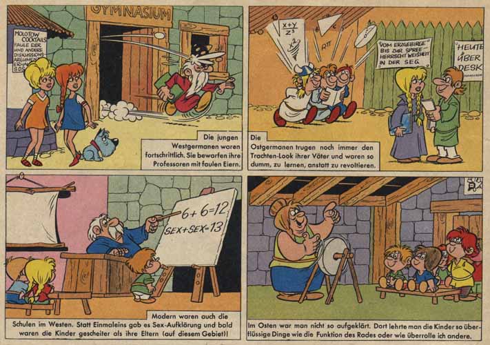 Zweite Hälfte des schönen Ost-West-Vergleichs aus dem Hause KAUKA, 38 Jahre her (siehe letzten Sonntag!). Autoritätsverlust und Sexualunterricht hier, Trachten und Technikverständnis dort. Wie hat sich der große Mann eigentlich die Wiedervereinigung vorgestellt?