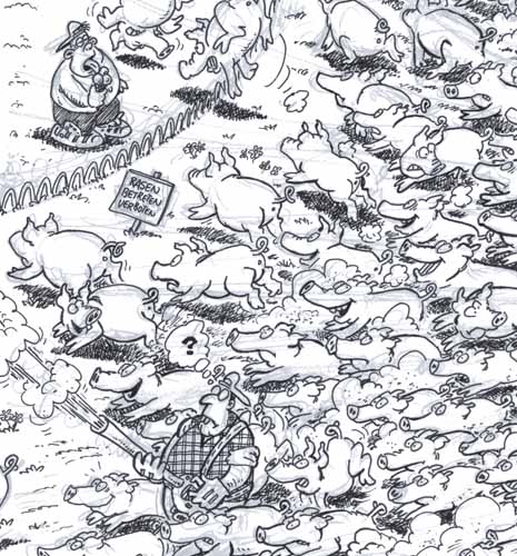 Noch ein kleines Detail aus dem Nachsatzbild für Band 2. Die blauen Linien gehören zur Vorzeichnung und werden "technisch nicht reproduziert". Da kam ich erst drauf, nachdem ich bereits tausend Seiten WÜTTNER nach dem Tuschen säuberlichst abradiert und mir dabei mehrere Schulterkapselrisse zugezogen hatte.