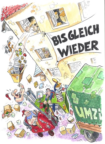 Dies ist eine Illu, die ich für den Baumhaus Verlag zeichnete, der zur Zeit in andere Räumlichkeiten umzieht. Kein Cartoon mit Pointe, aber ich will das Werk trotzdem niemand vorenthalten.