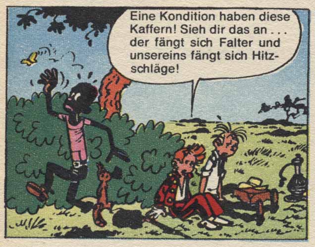 Heute machen wir's mal wie in der Hochkunst und präsentieren ein Fundstück, das durch seine Hervorhebung zum Kunstwerk geadelt wird: SPIROU in einer KAUKA-Version von 1970. Atmet dieses Stück nicht noch den nostalgischen Geist der 30er, liebe Mit-Bwanas? Die KAFFERN werden übrigens auch noch als SCHWARZE SCHRATE, SCHWARZE SCHEICHE, SCHWARZE SCHLUMPSÄCKE und HOTTENTOTTEN bezeichnet. Ob da Massa Kauka persönlich...?