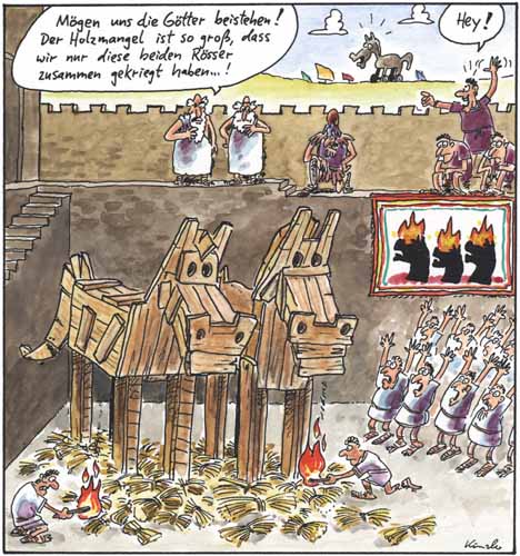 Die Trojaner haben sich schon mit einer Light-Version des "Festes der drei Feuerrösser" abgefunden, als ihnen die List der Griechen ungewollt aus der Patsche hilft.